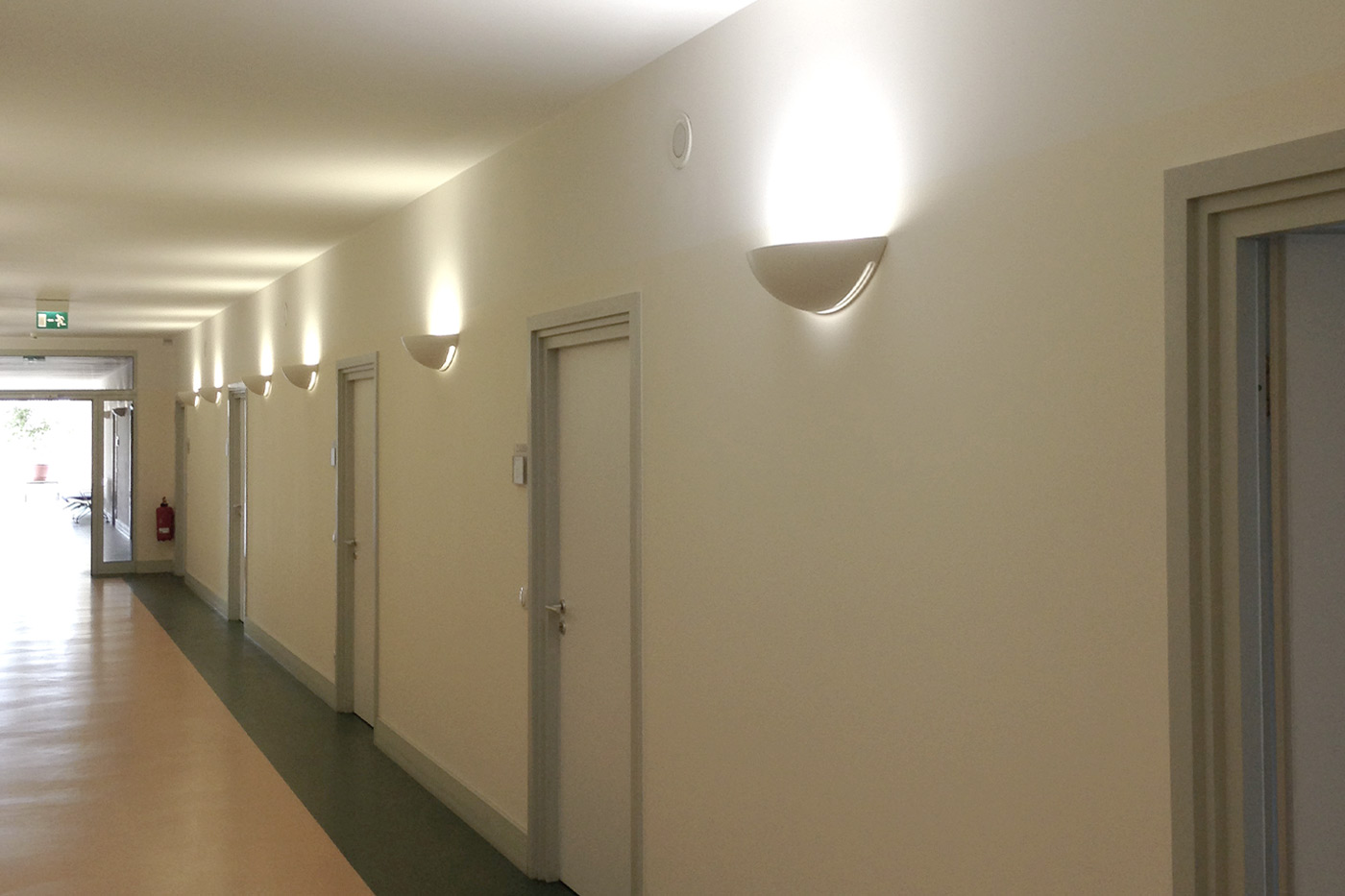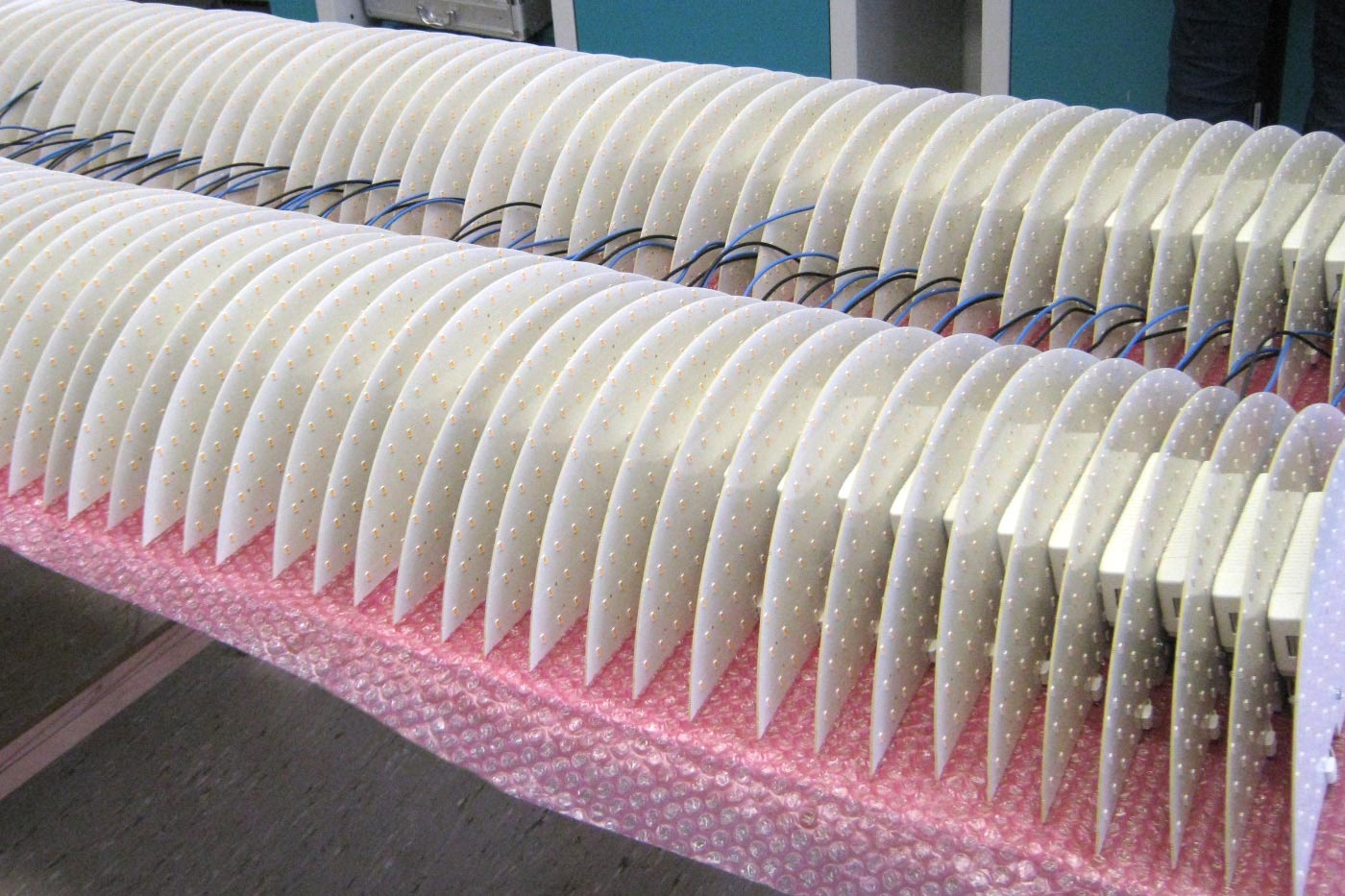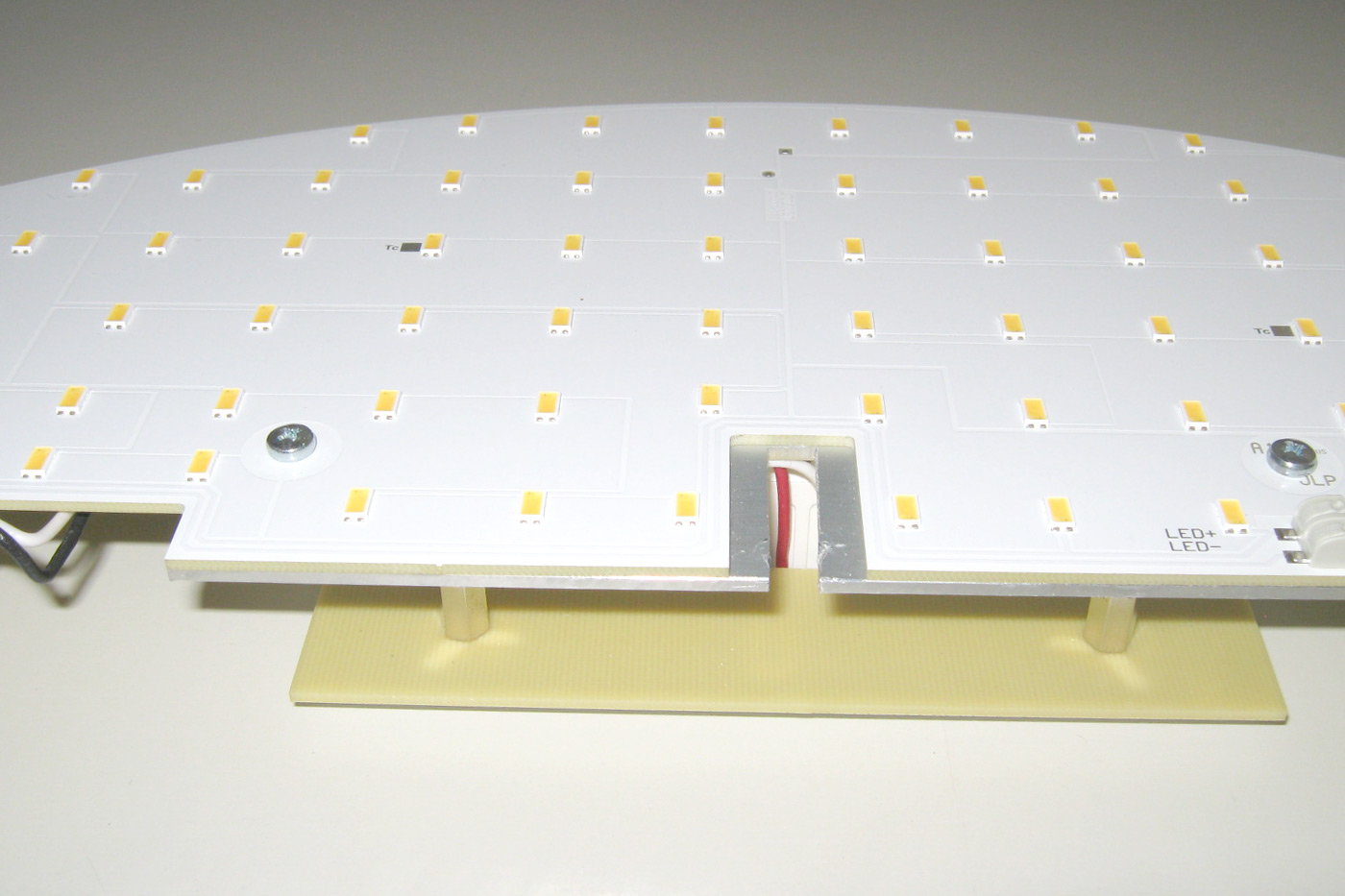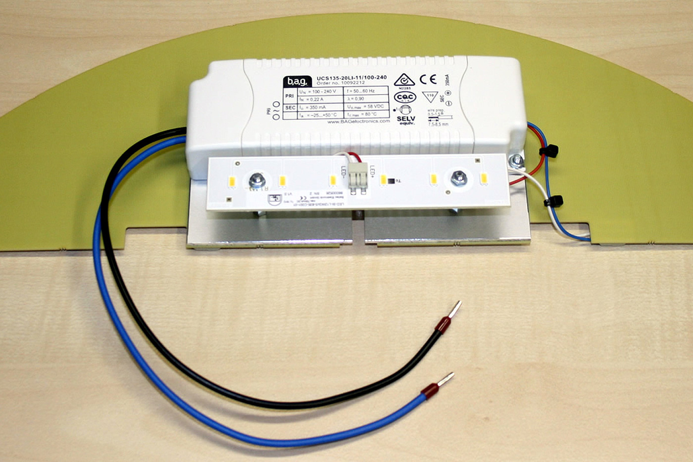 LS-Leuchten werden in LED-Technik umgerüstet. Gefertigt wurde ein energieeffizienter LED-Umrüstsatz für die indirekte Beleuchtung von Fluren mit einem kleinen direkten Lichtanteil nach unten. Die Befestigung erfolgte voll kompatibel zum vorhandenen Leuchten-Einsatz. Die vorhandene Konstruktion wurde weiter verwendet. Der Umrüstsatz wurde betriebsfertig geliefert und besteht aus folgenden fertig zusammengebauten Komponenten: