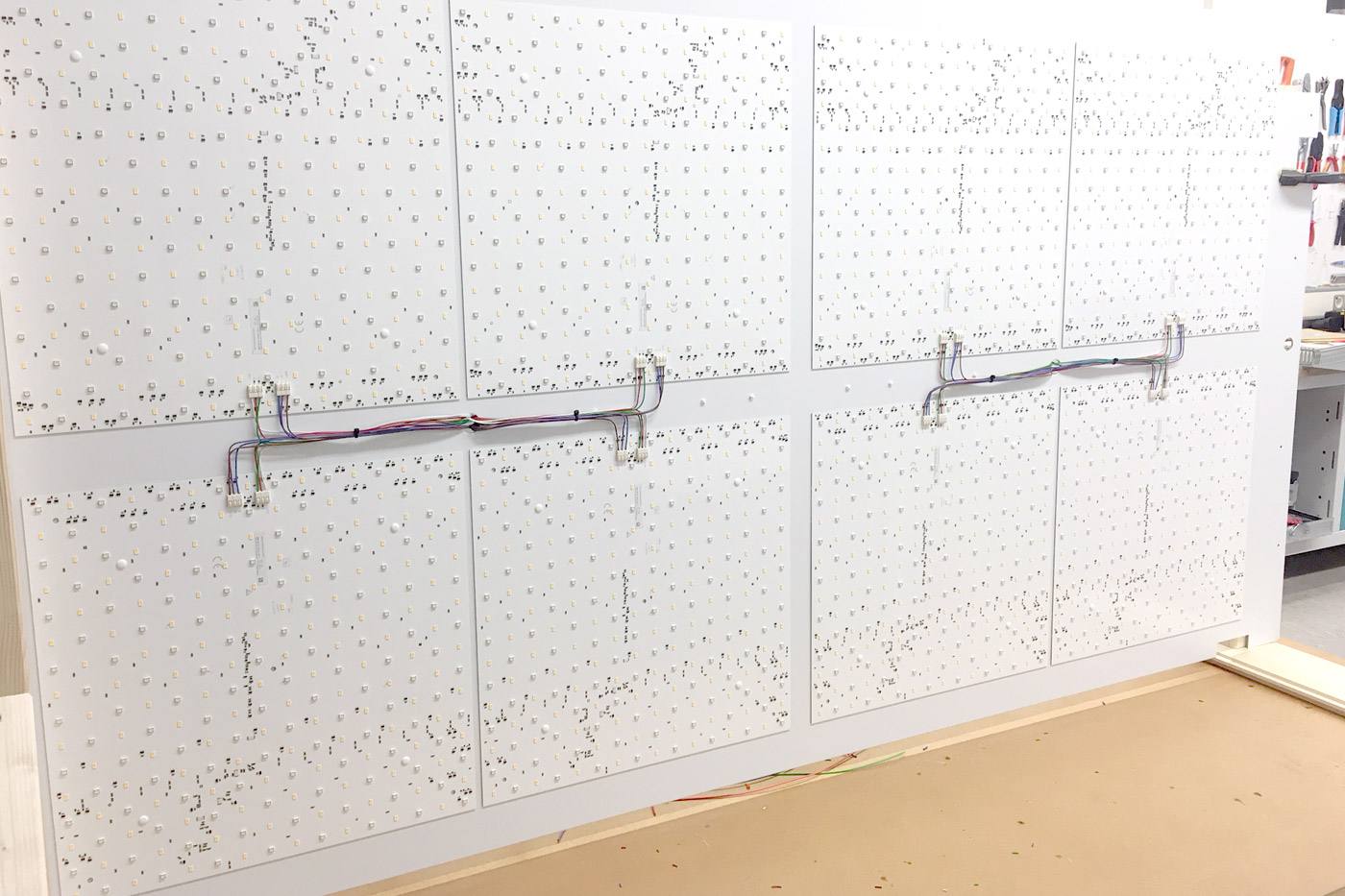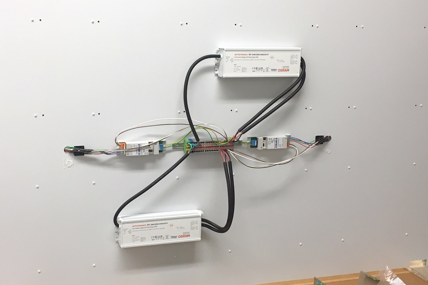 Für die an Wänden und Decke umlaufende Beleuchtung (siehe erstes Bild) wurden insgesamt 254 lfm LED-Leisten geliefert, das entspricht ca. 170 Stück LED-Leuchten, welche mit Anschlussleitung, Stecker und Buchse auf Maß gefertigt wurden. Die 41 Stück für die Ansteuerung benötigten LED-Dimmer und Netzteile wurden in drei zentralen Unterverteilungen platziert.