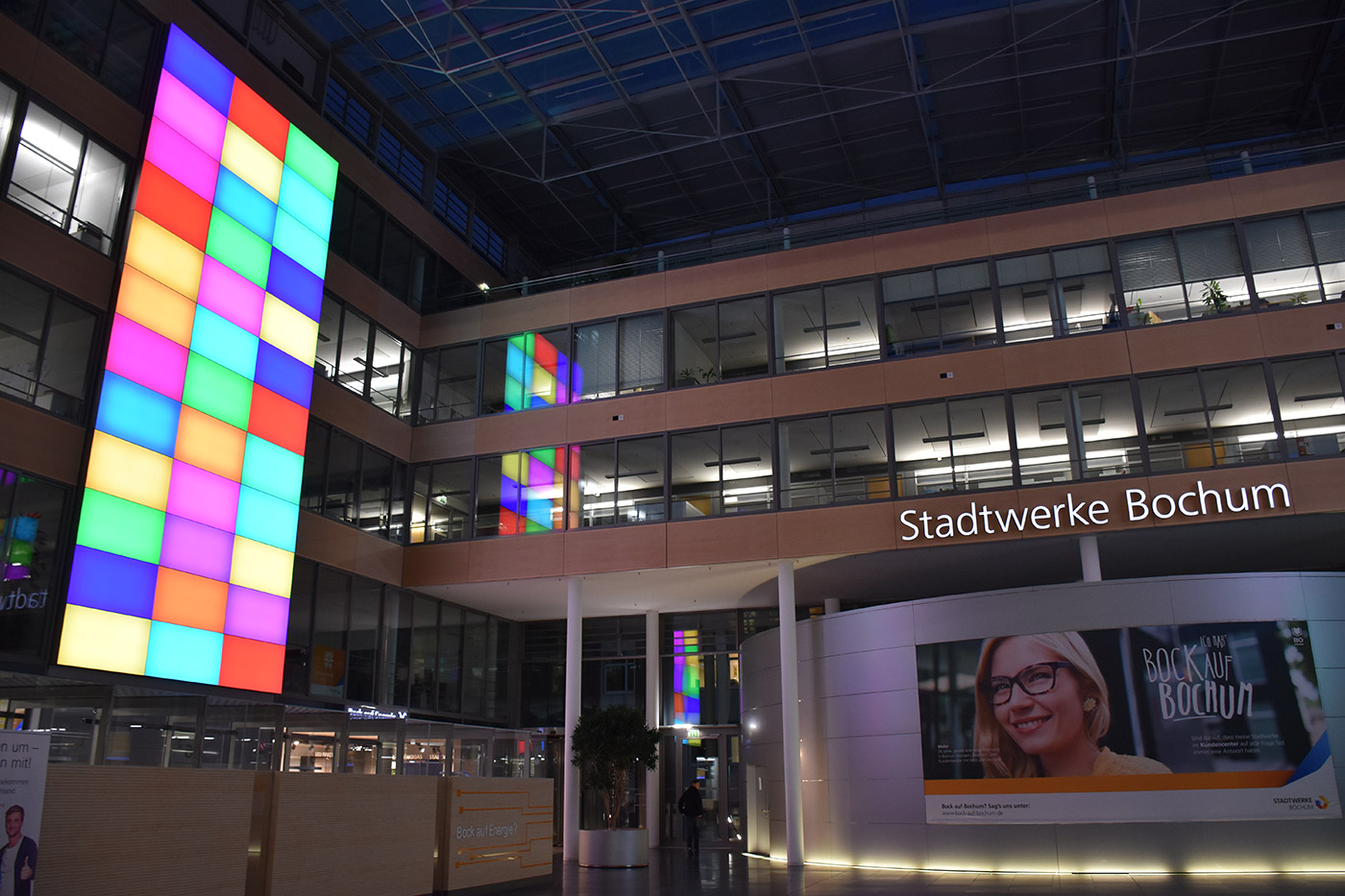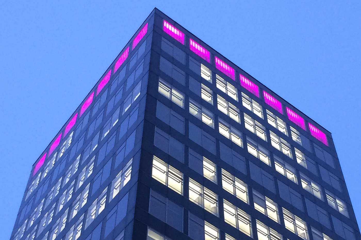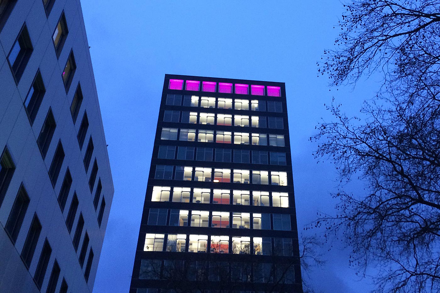 - Beleuchtung des Lichtkranzes außen: Spezielle RGBW-Profilleuchten sorgen für eine perfekte Ausleuchtung der Glasflächen am Hochhaus. Diese wurden für repräsentative Beleuchtungen konzipiert.