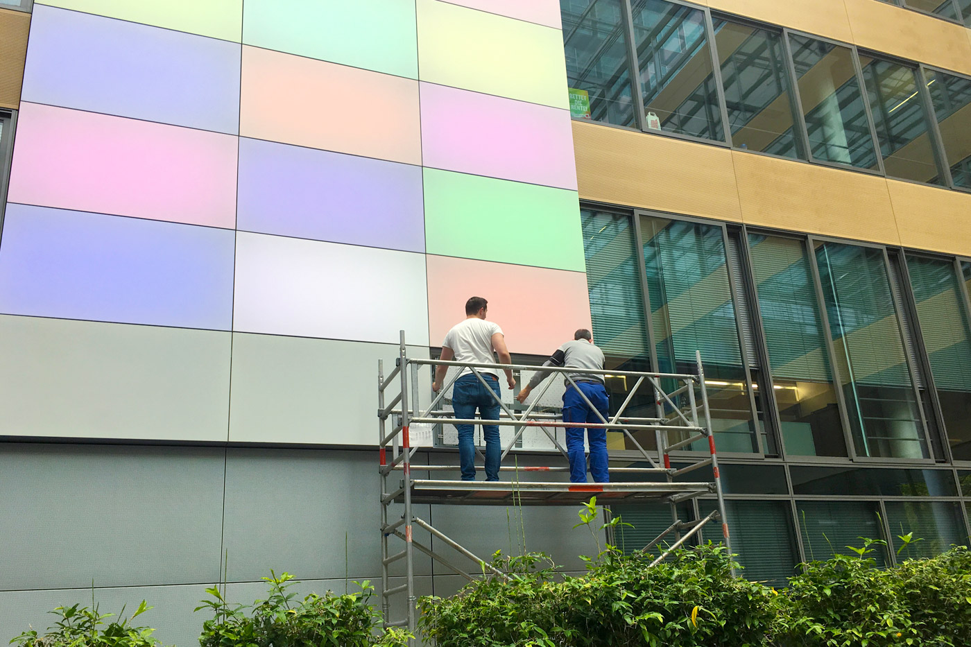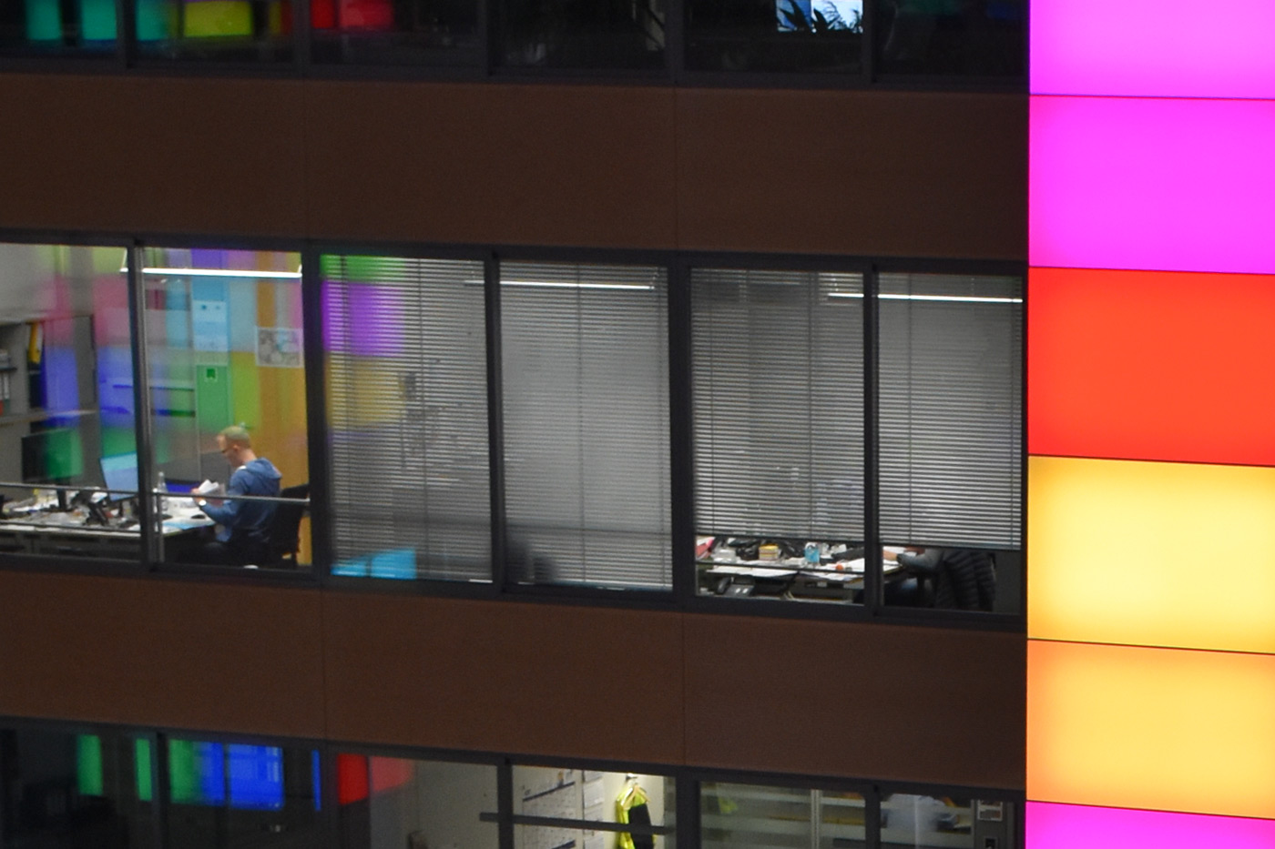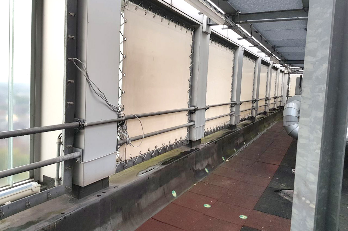 - Beleuchtung des Lichtkranzes außen: Spezielle RGBW-Profilleuchten sorgen für eine perfekte Ausleuchtung der Glasflächen am Hochhaus. Diese wurden für repräsentative Beleuchtungen konzipiert.