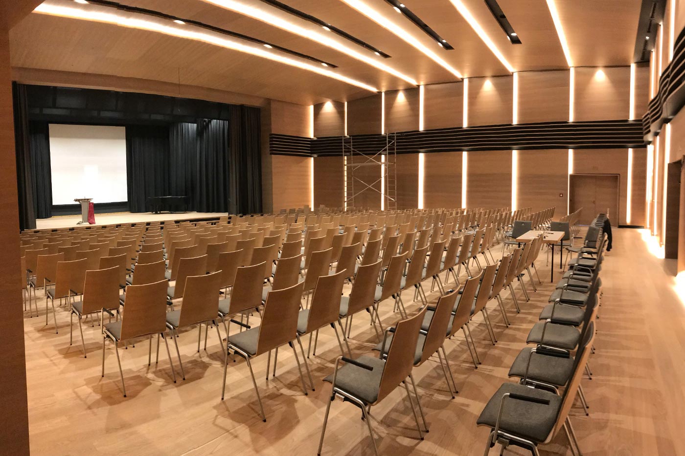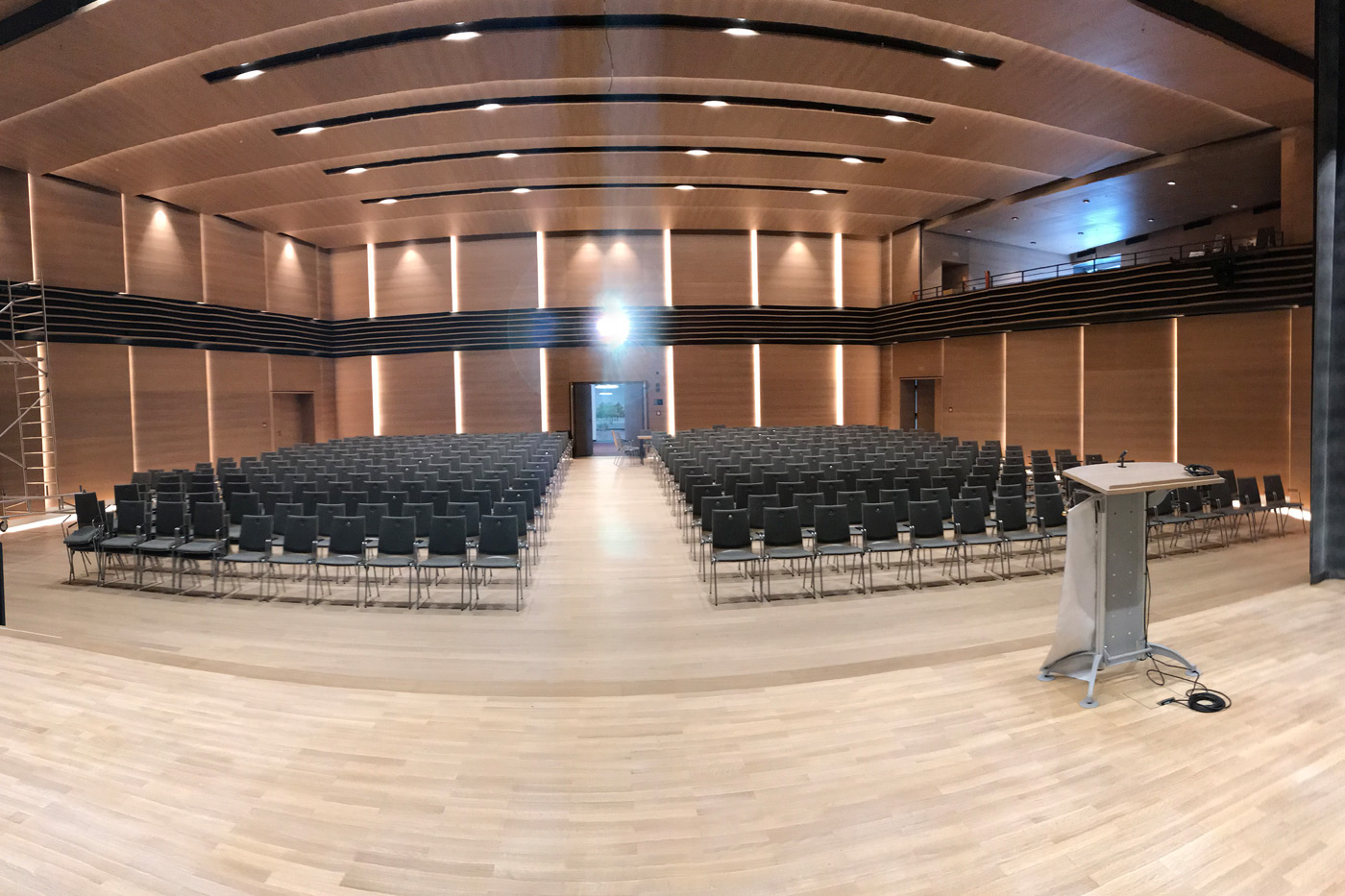 Die Beleuchtung im Theater Nürnberg wird über das ISYGLT-System gesteuert. Die Leuchten im Saal werden sowohl via DALI, als auch über DMX und unsere eigenen LED-Dimmer angesteuert. Zudem lassen sie sich gemeinsam mit den drei schaltbaren Steckdosen in vier Szenen hinterlegen. Auf der Bühne ist ein Panik-Taster vorgesehen, der die Beleuchtung sofort mit maximaler Helligkeit einschaltet. Das Licht bleibt dann solange auf 100%, bis die Panik-Beleuchtung in der Unterverteilung mittels eines Tasters deaktiviert wird.