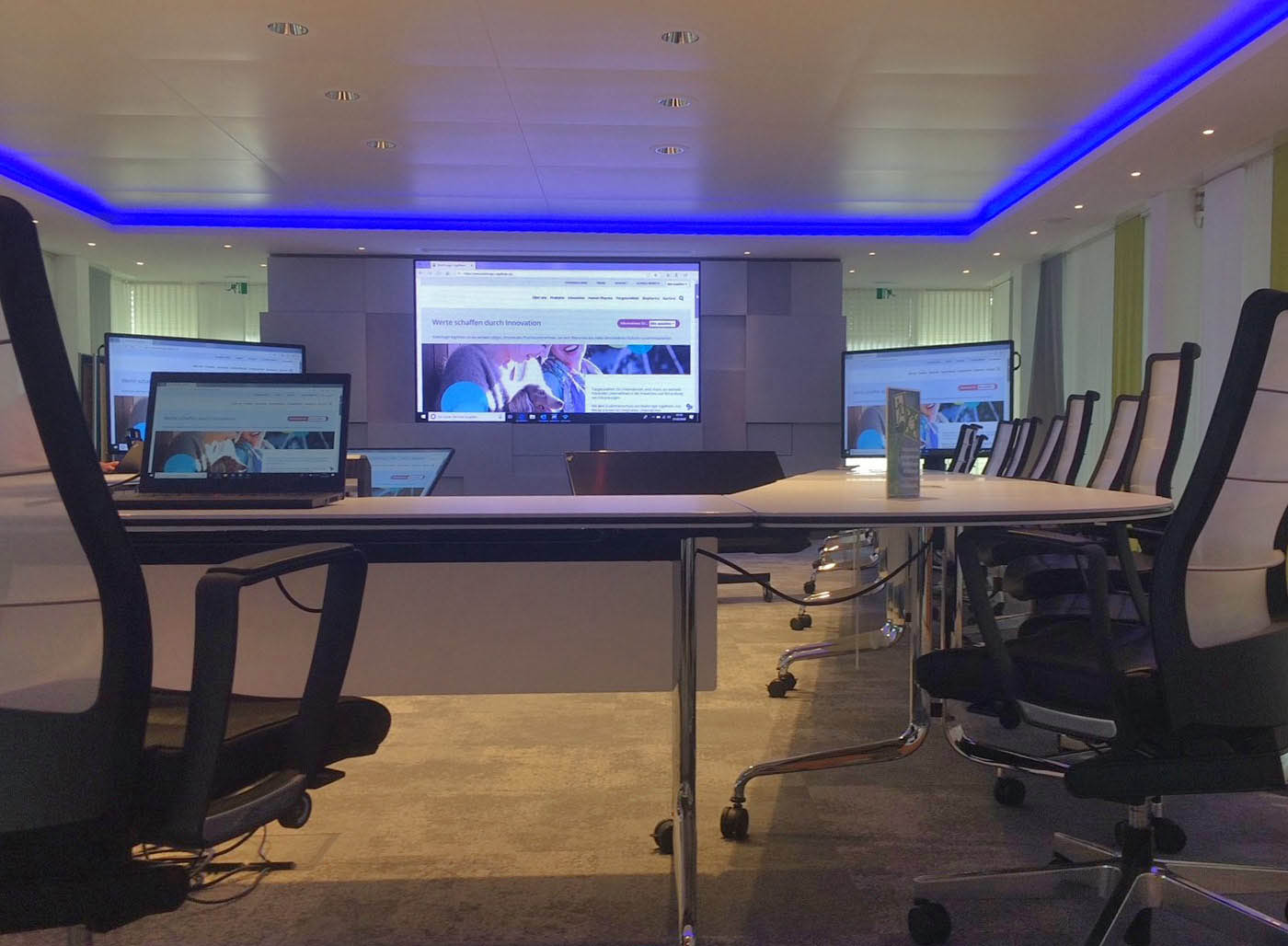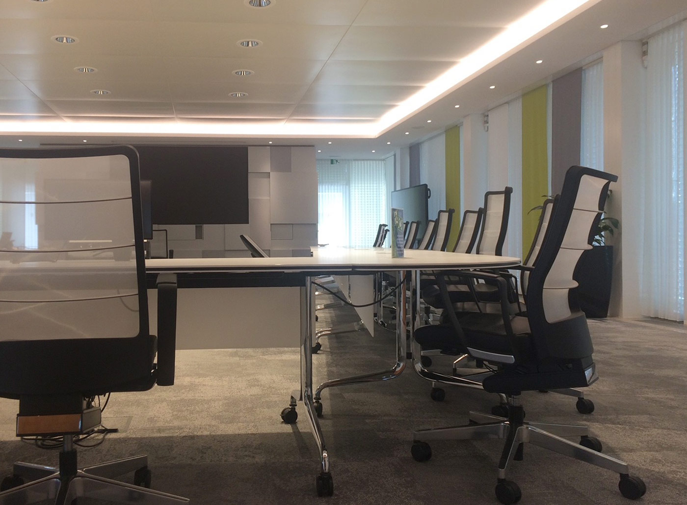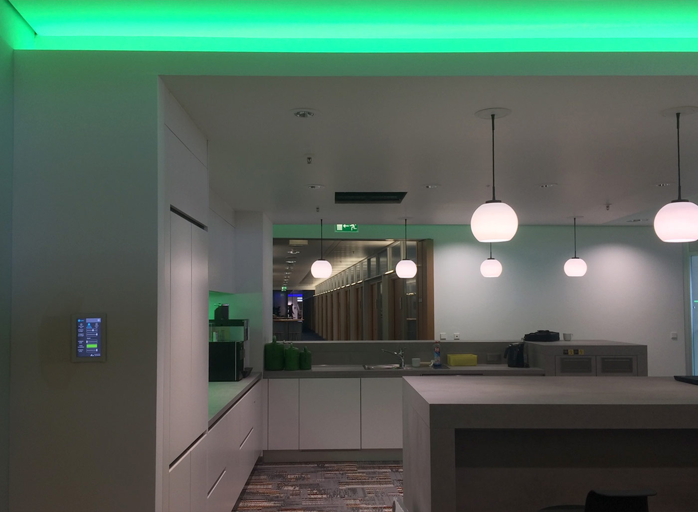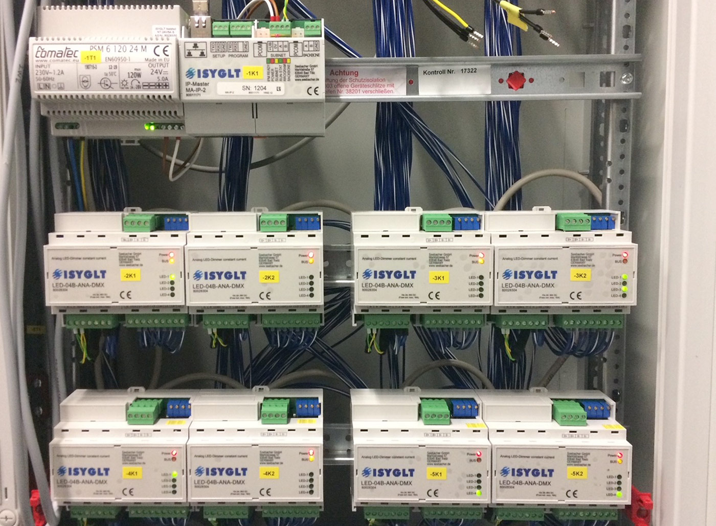 ...in deutschem Großkonzern. 300 Meter RGBW-LED-Leuchten werden über das ISYGLT-System gesteuert. Je nach örtlicher Situation wurden ISYGLT-Dimmer zum Deckeneinwurf oder zentral als REG-Modul gewählt. Für die spezifischen Anwendungen wurden teilweise auch spezielle analoge LED-Dimmer ohne PWM-Frequenzen verwendet. Somit sind sie 100% kameratauglich und ohne Beeinflussung für die menschliche Befindlichkeit.