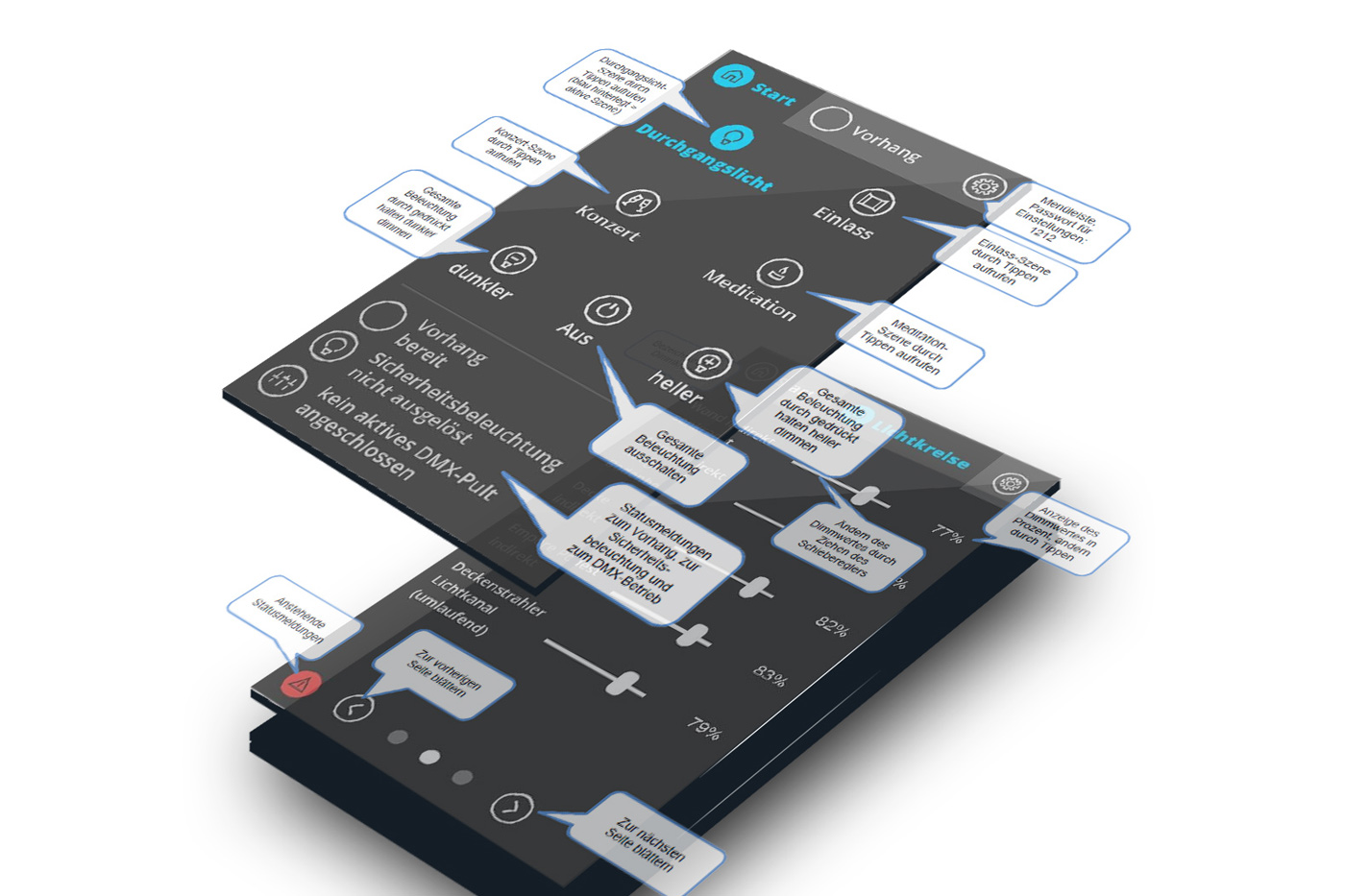 - Bedienung / PC-Visualisierung: Komfortable Bedienoberfläche, die es ermöglicht, mit den entsprechenden Endgeräten (Smartphone, Tablet oder Desktop-PC) die Bedienung der Lichtwand und somit die einzelnen BUS-Funktionen zu steuern. Das Interaktionskonzept ist plattformunabhängig und somit auf vielen verschiedenen Systemen (Windows, Linux u.a.) lauffähig.