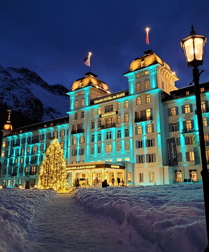 For the start of the 2021 summer season, the facade of the Grand Hotel des Bains Kempinski St. Moritz glows in a new lighting design