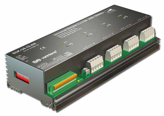 Der SDK-U4-10-AN (0-10V) ist ein robuster Dimmer in Phasenanschnitt- und Phasenabschnitt-Technik. Er kann einerseits durch verschiedene Arten angesteuert werden und andererseits auch verschiedenste Lasten regeln: