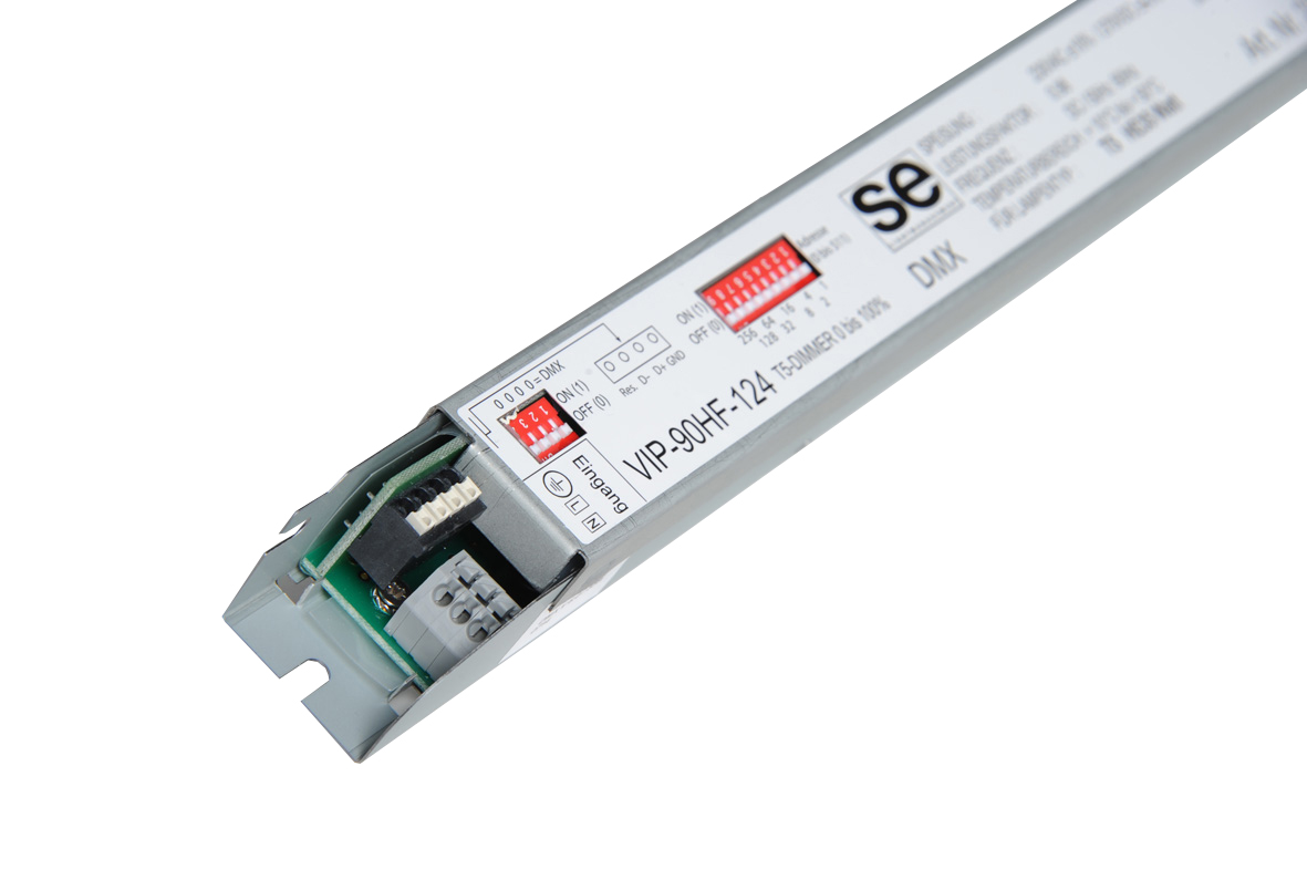 Das VIP-90HF-124 (35W DMX) ist ein FL-Dimmer, in Mikrocontroller-basierter Hochfrequenz-Technik für HE35W / T5-Leuchtstofflampen. Es zeichnet sich durch folgende Vorteile aus: