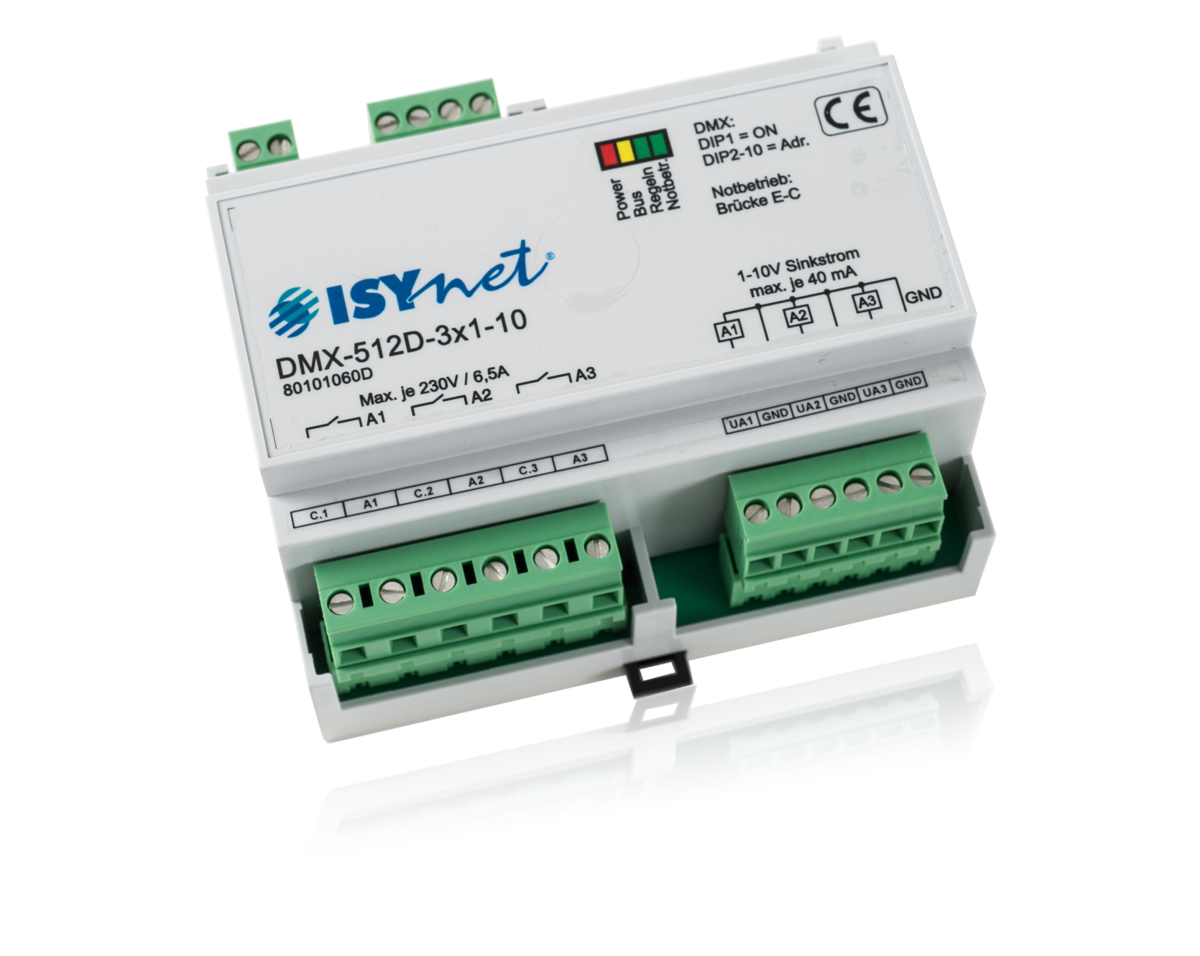 Der DMX512 Demultiplexer DMX-512-3x1-10 ist für die Ansteuerung von gedimmten Leuchtstofflampen mit EVG 1-10V konzipiert.