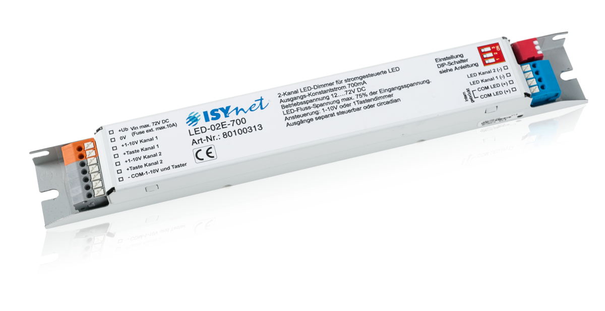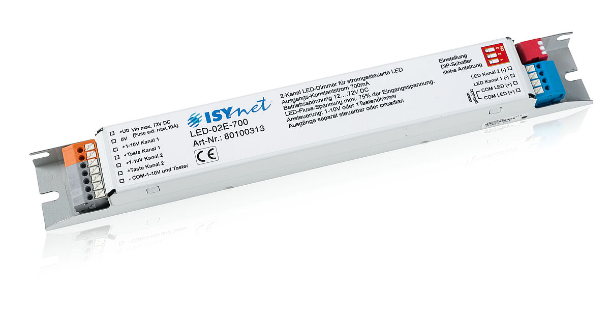LED-Dimmer mit 2 Ausgängen für stromgesteuerte LEDs mit einem Konstantstrom von je 700mA. Dimmung 0-100% hochauflösend, monochrom farbig oder auch circadian/HCL (Human Centric Lighting WW/KW).