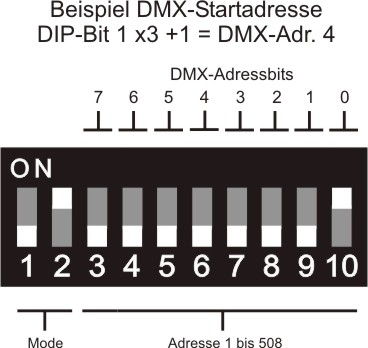 Mit den DIP-Schaltern 3 bis 10 wird die DMX-Adresse festgelegt. Die eingestellte Adresse, multipliziert mit 3 und addiert mit 1, entspricht der ersten von 3 aufeinander folgenden DMX-Adressen: