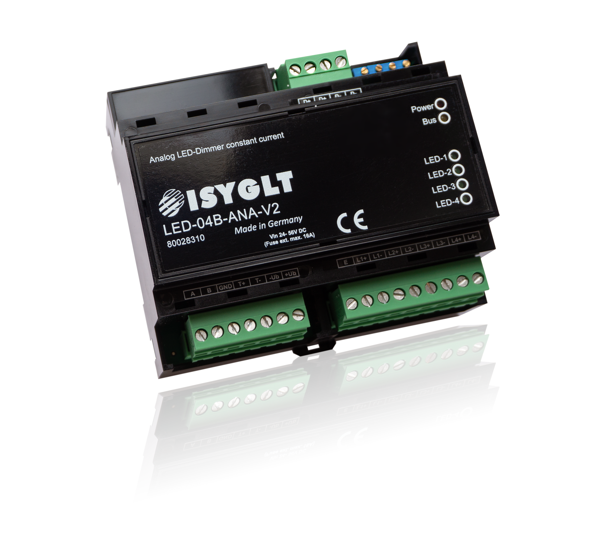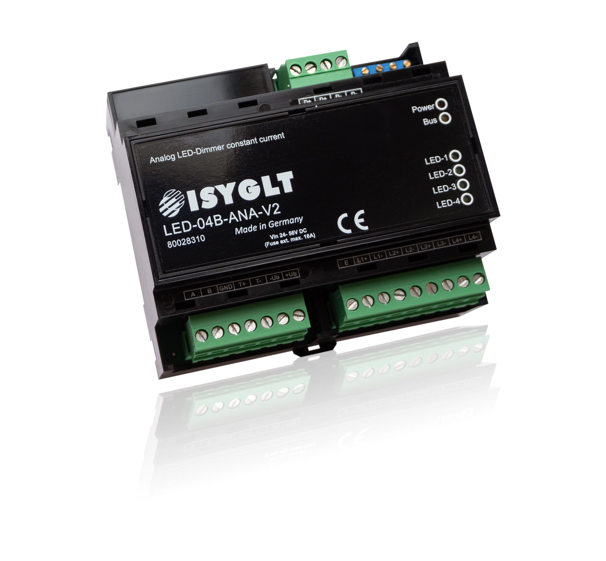 Analog-LED-Dimmer - non-PWM - mit 4 unabhängigen Konstantstrom-Ausgängen, CC (constant current) 250mA bis 1550mA. Dimmung 0-100% hochauflösend (19 Bit), Kanäle zur Leistungssteigerung koppelbar.
