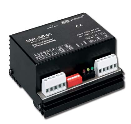 Der SDK-AB-05 ist ein robuster Dimmer in Phasenabschnitt-Technik. Er kann einerseits durch verschiedene Arten angesteuert werden und andererseits auch verschiedenste Lasten regeln: