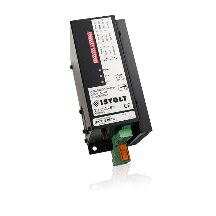 Der TD-Dimmer ist ein klassischer Phasenanschnittdimmer in 16-Bit "Thyristor Antiparallel Technologie". Diese Steuerungsart ist mit Sicherheit die Oberklasse der Dimmer und nicht mit den einfacheren Triac-Dimmern zu vergleichen. Hier erfolgt die Ansteuerung und Überwachung für jede Halbwelle getrennt, da entsprechend jeweils ein Thyristor vorhanden und zuständig ist. Der Dimmer zeichnet sich durch seine extreme Robustheit in der jeweiligen Leistungsklasse aus. In der Phasenanschnittsteuerungstechnik können alle ohmschen Lasten (Glühlampen, Hochvolthalogen, Heizungen) und induktiven Verbraucher (Halogen mit magnetischen Trafos, Leuchtstofflampen mit VIP-90, Motore, Kunststoffschweißgeräte mit magnetischen Trafo) betrieben werden. Der Dimmer verfügt über mehrere Ansteuerungsarten und kann konventionell mit internem oder externem Poti, Taste, 0-10V, 1-10V oder 0-55µA-Signal oder digital im ISYGLT-BUS, DMX512 8-Bit oder DMX512 16-Bit betrieben werden. Die Grundfunktionsparametrierung erfolgt über 2 DIP-Schalter, Detailparameter sind nur im ISYGLT-System einstellbar.