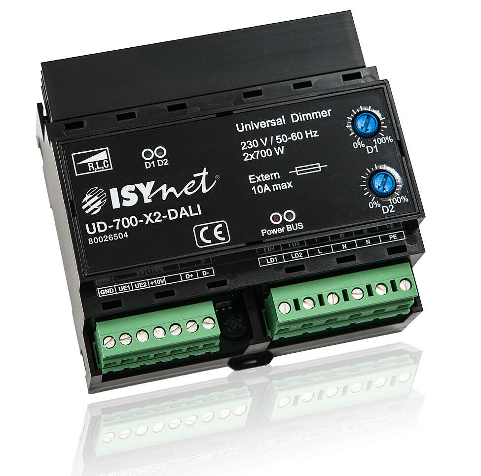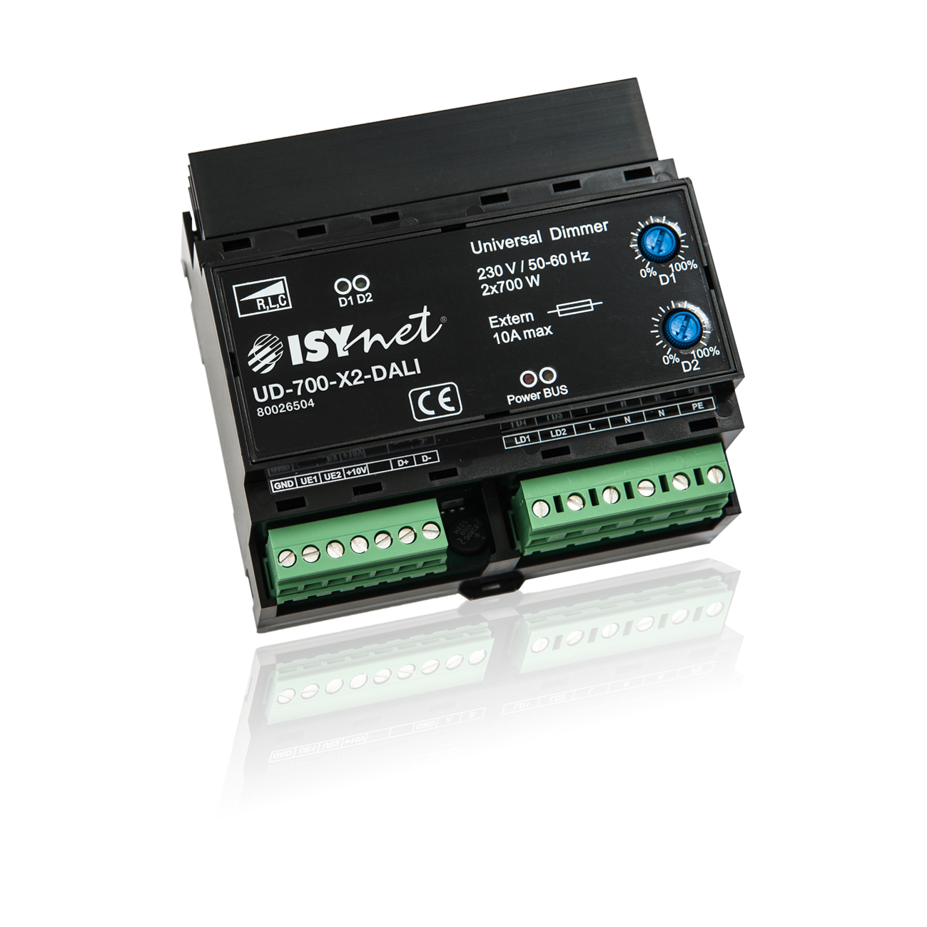 Den erfolgreichen und zuverlässigen Universal-Dimmer UD-700-X2 gibt es jetzt auch mit DALI-Schnittstelle. Alle (per Phasenanschnitt/-abschnitt) dimmbaren Leuchtmittel (z.B. dimmbare LED-Lampen) können damit perfekt gedimmt werden. Er benötigt keine Mindestlast und dimmt schon ab einer LED-Retrofit flackerfrei. Auch eine große Anzahl LEDs stellt kein Problem für den Dimmer dar.