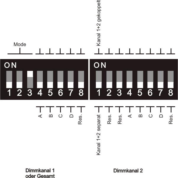 A/B/C/D DIP-Schalter - Betriebsarteinstellung bei DALI- und Standalone-Betrieb