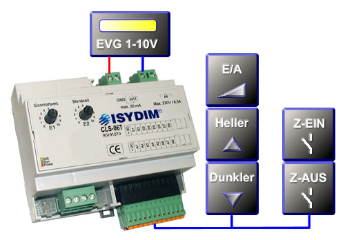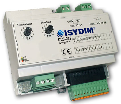 Das CLS-06T Lichtsteuergerät ist eine Komfortlösung für Beleuchtungssteuerungen mit genormter 0(1)-10V-Schnittstelle für Source- und Sinkbetrieb. Die Schnittstelle ist mit 20mA belastbar und dient zum direkten Anschluss von dimmbaren Leuchtstofflampen mit EVG 1-10V oder NV-Halogenlampen mit 1-10V Trafo. Zum Analog-Ausgang ist auch ein Hybrid-Relais-Schaltausgang mit einer Belastbarkeit von 230V, 1500VA, 6,5A vorhanden. Dieser ist durch eine spezielle Schaltung im Nulldurchgang für EVG-Lasten optimiert und garantiert eine sichere Netzschaltung zur Dimmung. Durch die Verwendung von zusätzlichen Leistungsdimmern sind die unterschiedlichsten Anwendungen und Leistungsklassen realisierbar. Basis des Steuergerätes ist eine digitale, zukunftsweisende Multiprozessortechnologie, die einfach zu bedienende Funktionen und einen äußerst sicheren Betrieb garantiert.