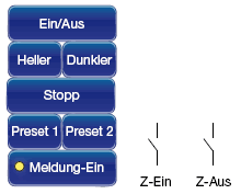 Über die Funktion Z-Ein (100%) und Z-Aus sind übergeordnete Steuerungseingriffe möglich. Damit sind mehrere Gruppen gleichzeitig ein- oder ausschaltbar (z.B. Zentral-Tableau beim Pförtner). Als Meldung, ob die Beleuchtung noch an ist, steht ein 24V-Ausgang zur Verfügung.