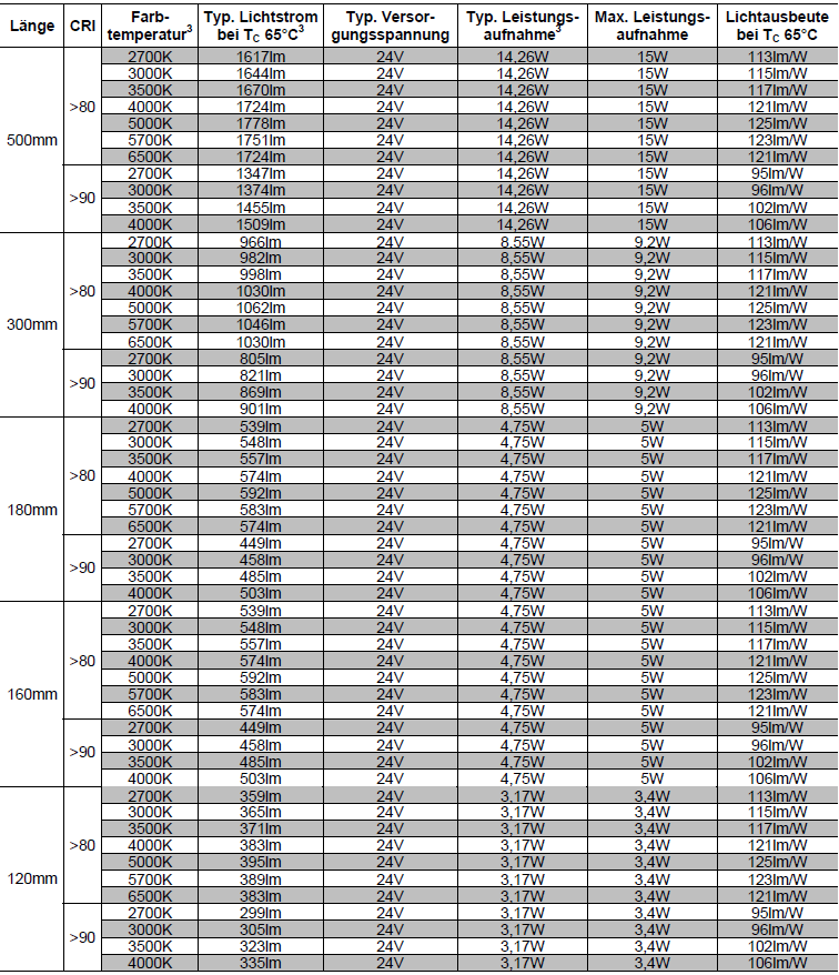 | Lebensdauer | >60000h für L80B50^2 bei Tc 65°C |