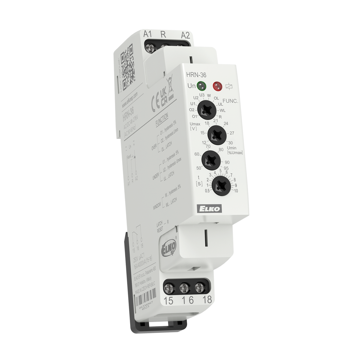 Das Überwachungsrelais HRN-36 dient zur Überwachung des Spannungsniveaus in einem DC Versorgungsbereich. Die überwachte Spannung ist gleichzeitig auch die Versorgungsspannung. Bei dem Relais ist es möglich, 2 unabhängige Niveaus einzustellen.