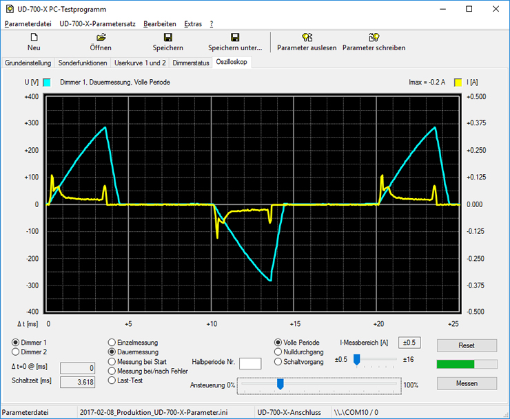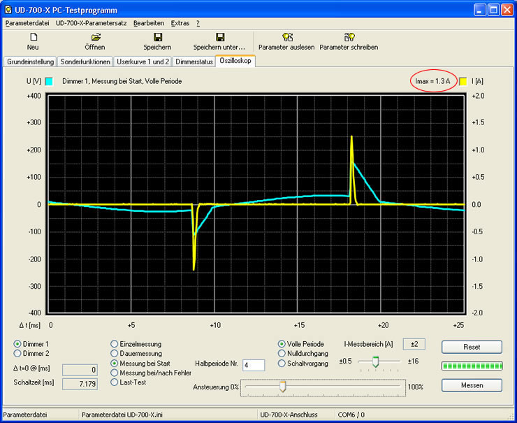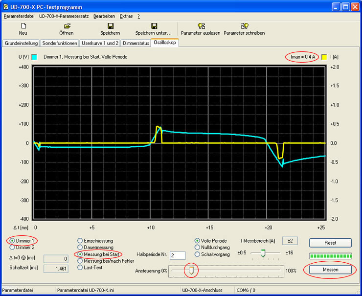 Hier "Messung bei Start" und z.B. "Halbperiode 2" auswählen (evtl. Tests auch mit anderen Einstellungen durchführen). Einstellung "Dimmer 1", Schieberegler nach links, Taste "Messen" anklicken, nun Schieberegler etwas hochziehen.