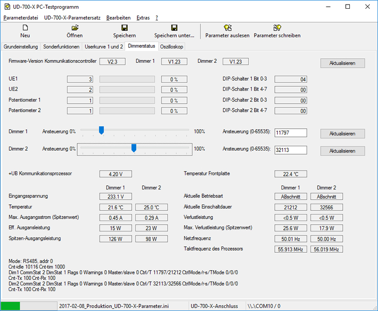 | Parameter schreiben | Die aktuellen Parameter aus den Registern in den Dimmer übertragen |