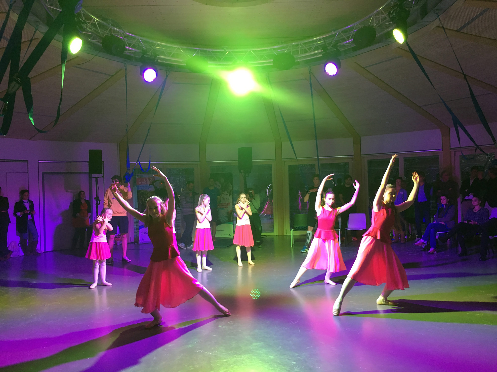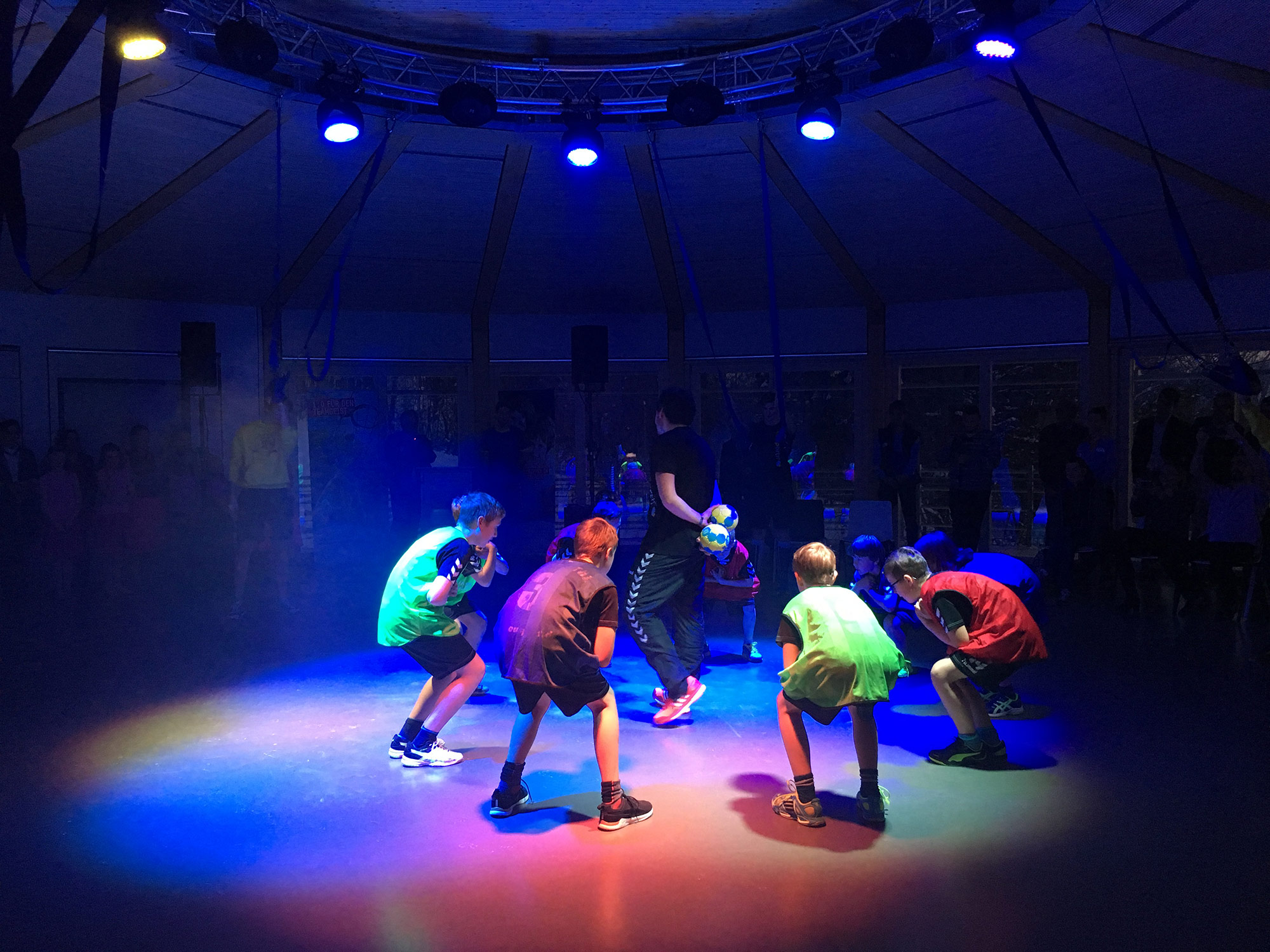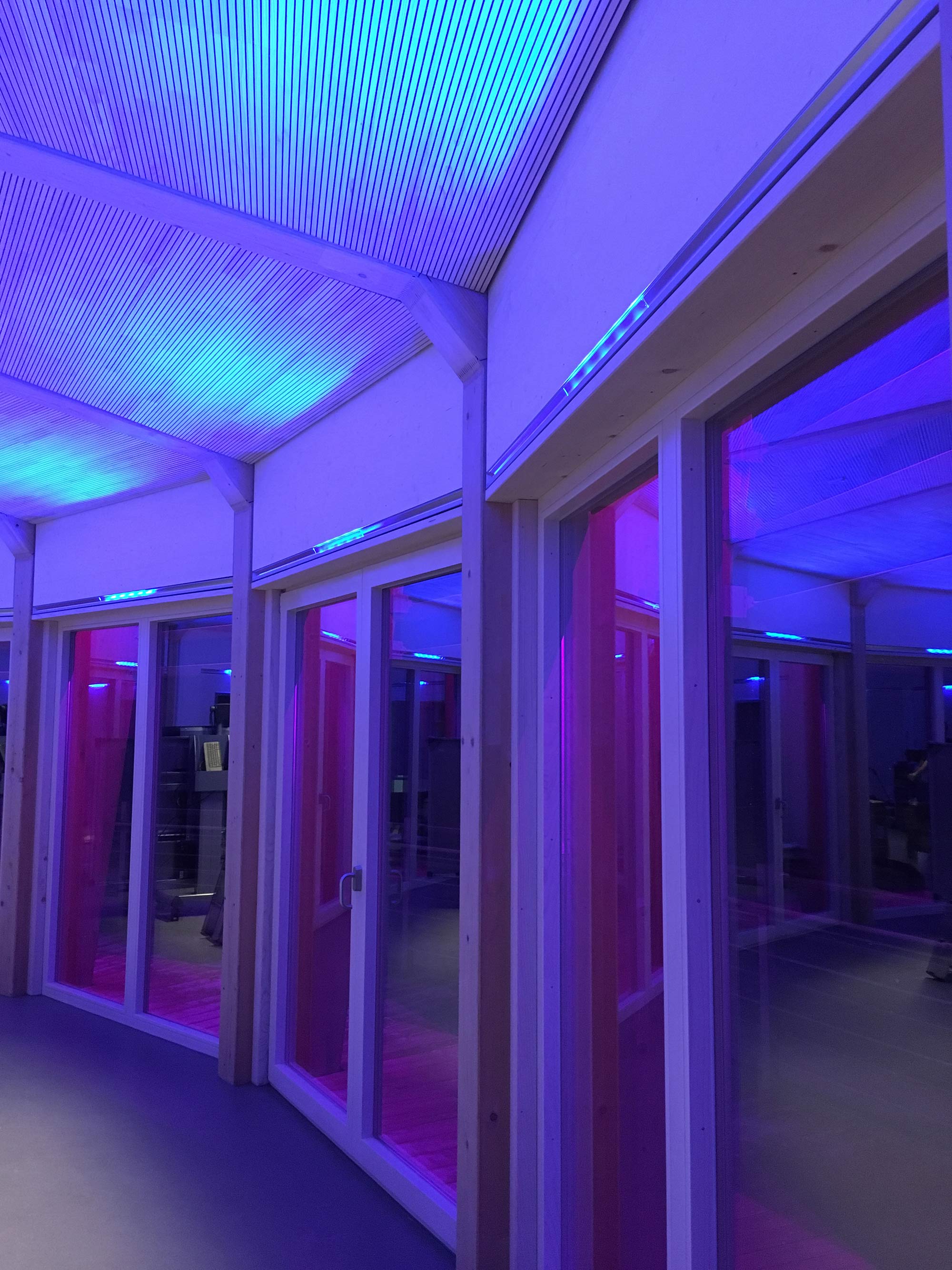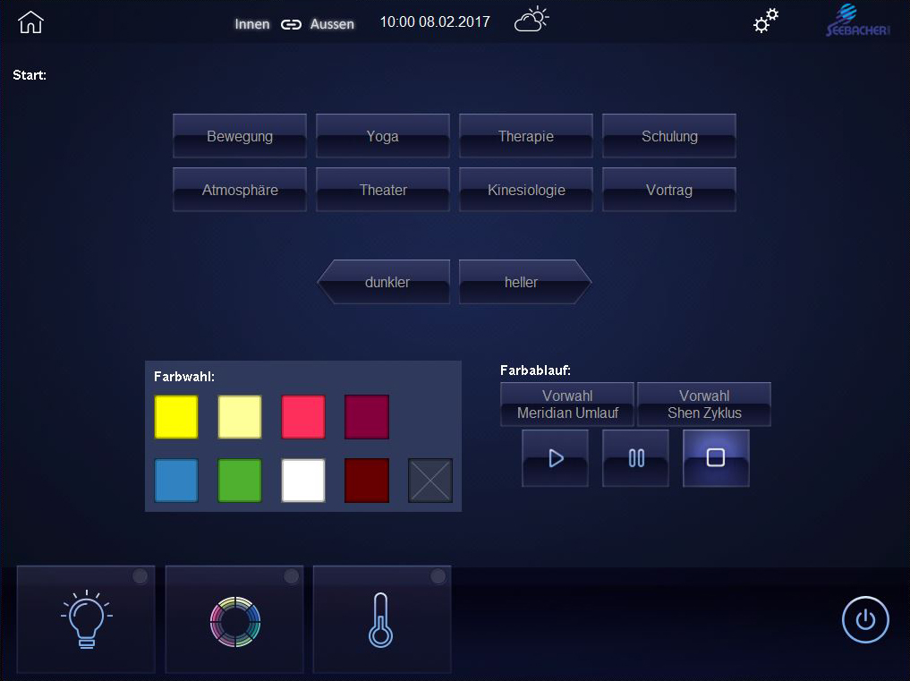 Die Lichtstimmungen sind unter anderem für die speziellen Anforderungen von sportkinesiologischen Übungen eingestellt. Dabei unterstützen die voreingestellten Farbabläufe „Meridianumlauf“ und „Shen Zyklus“ das Training. Das Farblicht übernimmt bei bestimmten Übungen unterstützende und auf unser Tiefenbewusstsein wirkende Aufgaben. Dadurch können Aktivität, Entspannung und die gezielte Unterstützung einzelner Körpersysteme beeinflusst und gefördert werden. Die vielfältige Nutzung des Raumes wurde in Einklang mit einer einfachen Bedienung gebracht. Auf der Startseite einer modernen Touch-Bedienstelle sind die wichtigsten Funktionen. Detailfunktionen sind auf untergeordneten Ebenen sowie administrative Einstellungen in der passwortgeschützten Profi-Einstellung angeordnet, um eine einfache und intuitive Bedienung zu gewährleisten.