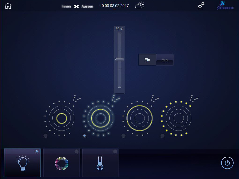 Die Firma Seebacher hat speziell für das Projekt eMotion Base ihr Visualisierungsdesign überarbeitet und erstmals in diesem Projekt eingesetzt. Das zeitgemäße Design funktioniert angelehnt an moderne App-Bedienoberflächen und erleichtert dem Nutzer so die Bedienung.