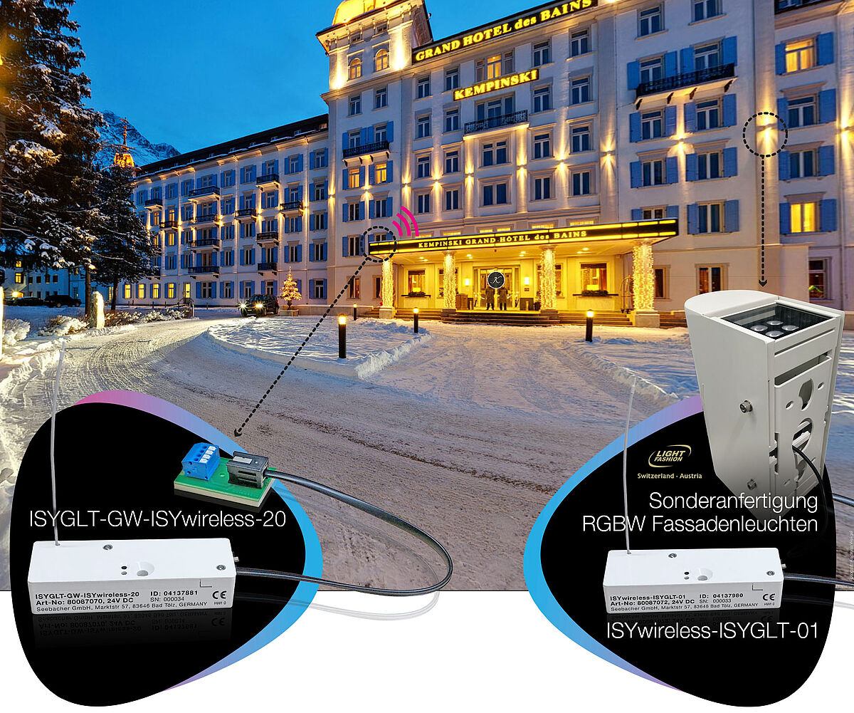 Die Bestandsverkabelung sollte, nach dem Wunsch des Auftraggebers, beibehalten werden. Unter Leitung unseres Kooperationspartners 'Light Fashion - Switzerland, Austria' durften wir die szenische Fassadenbeleuchtung realisieren. Die Besonderheit der neuen Fassadenbeleuchtung liegt darin, dass die angefertigten RGBW-LED-Fassadenstrahler durch unser neues Funkmodul ISYwireless-ISYGLT-01 angesteuert werden.