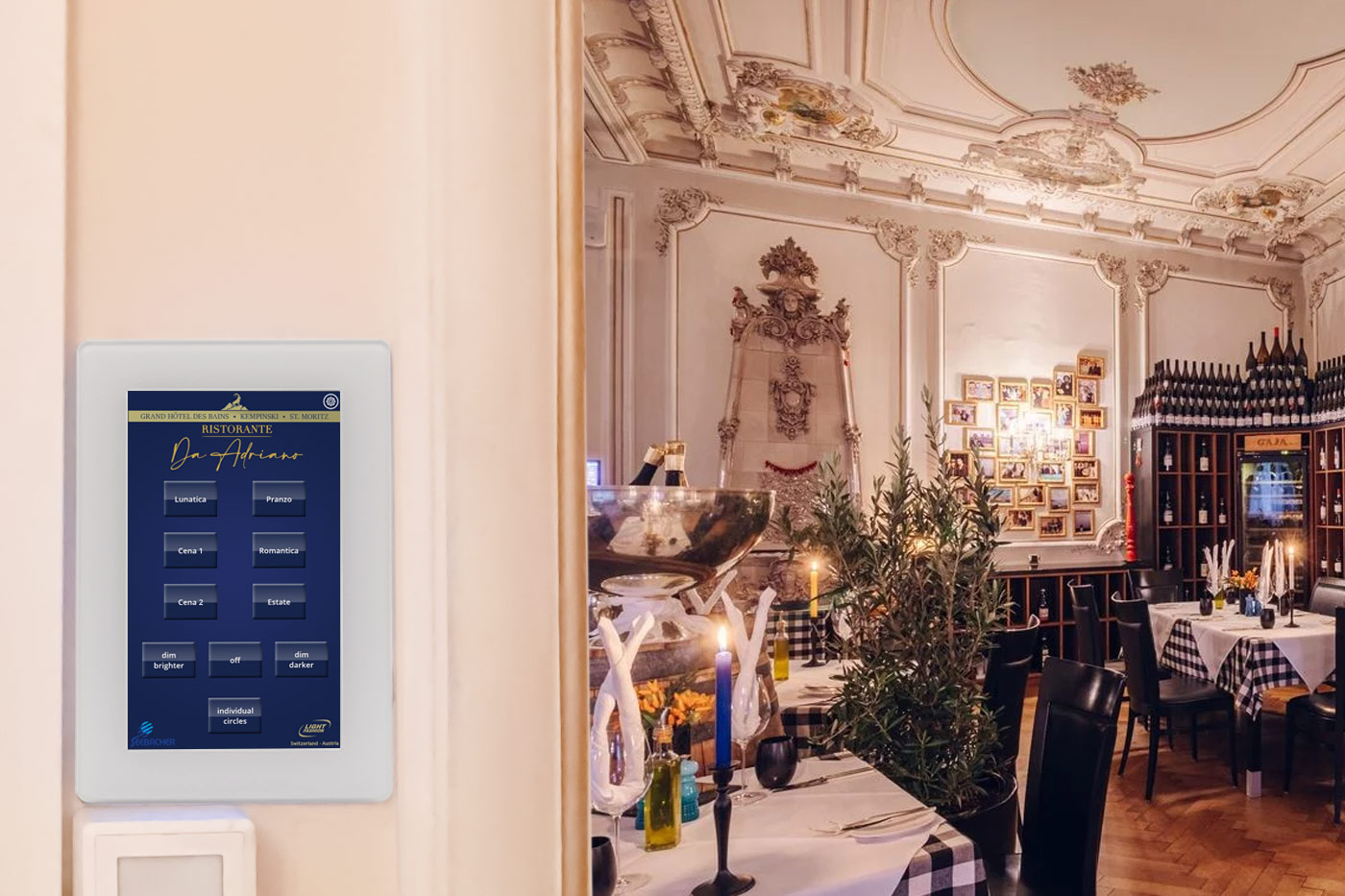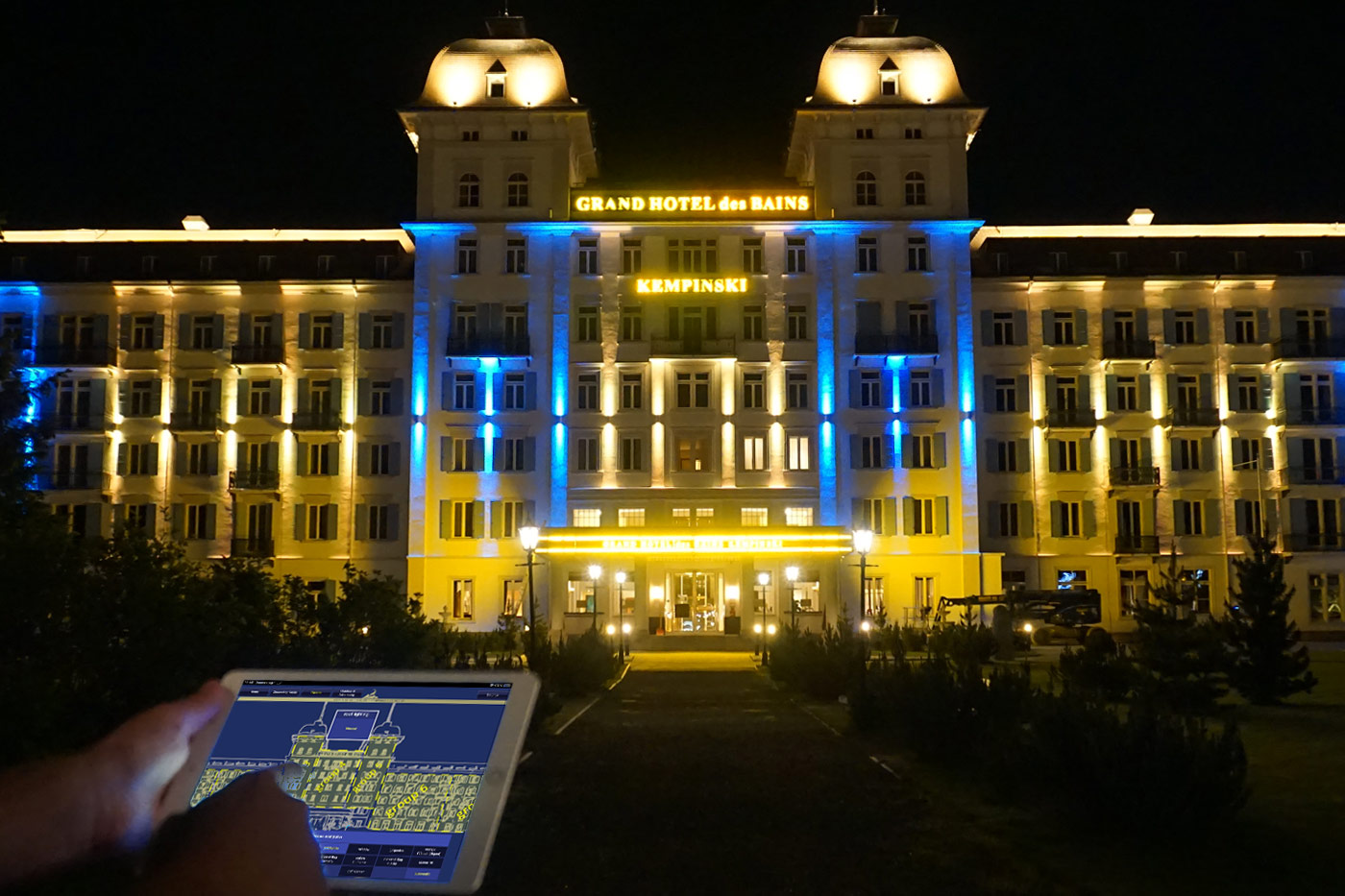 Ferner steuern wir die Beleuchtung im Innenbereich (Eingangshalle, Bar, Enoteca sowie zwei weitere Restaurants, Flure und Treppenhäuser), die Dachbeleuchtung und die gesamte Außenbeleuchtung mit Parkterrain, Brunnen, Flaggen, Wegen, etc.