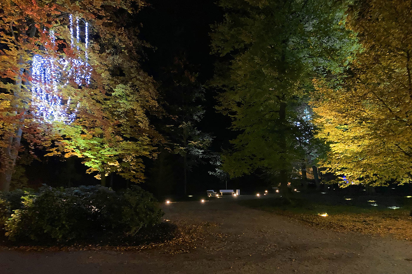 Die Farbakzentuierungen der Parkanlagen sind fein abgestimmt und sollen die Leistungen des starken Gärtnerteams optimal in Szene setzen. In der Kastanienallee wurden so gezielt Beleuchtungsnuancen eingesetzt, die der Laubart des Gehölzes entsprechen und diese nicht verfälschen.