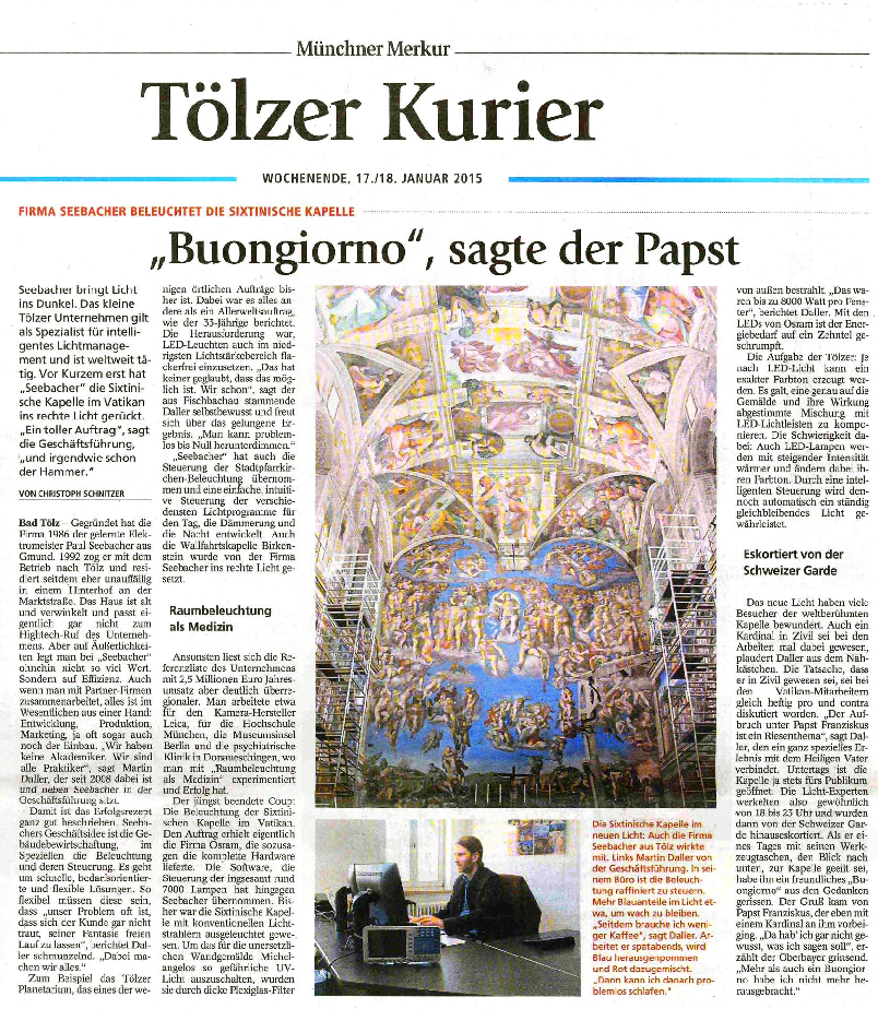 In Zusammenarbeit mit der Firma OSRAM wurde die Sixtinische Kapelle im Herzen des Vatikan mit einer der modernsten Lichtsteuerungssysteme im musealen Bereich ausgestattet. Ziel des von der EU geförderten Projekts war eine drastische Verringerung des Strombedarfs, eine hohe Farbtreue und gleichmäßige Ausleuchtung sowie der Schutz der Gemälde.