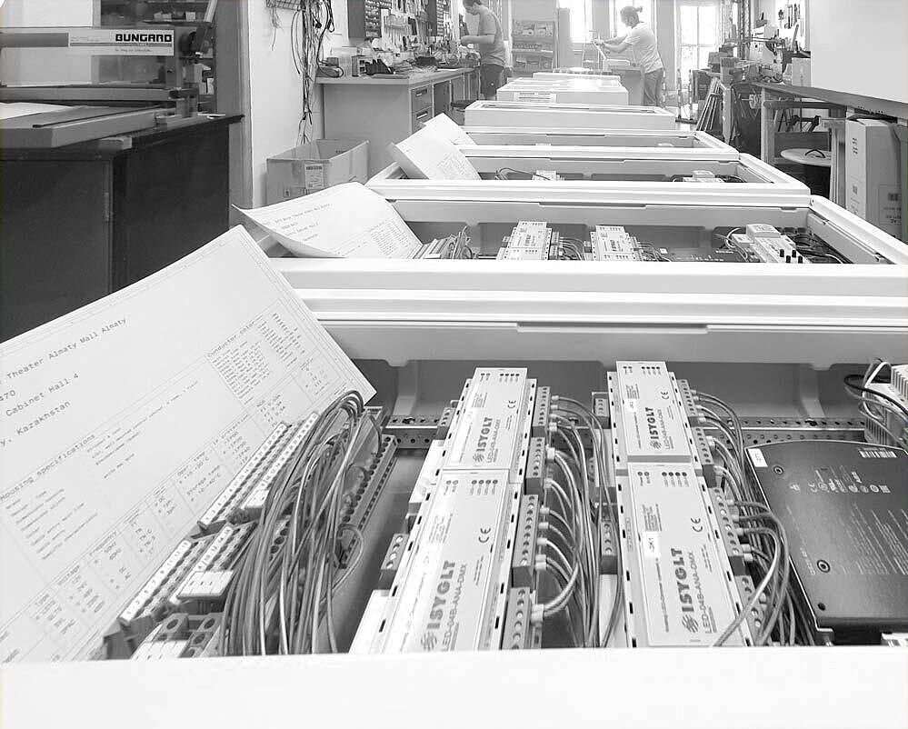 Unsere Kunden schätzen unsere Qualität, auch in Serienfertigung. Ob kleine Anlagen für Bio-Solar-Häuser und Kinosäle in Kasachstan oder auch große Schaltschränke für Theater, Museen und gewerbliche Gebäude.
